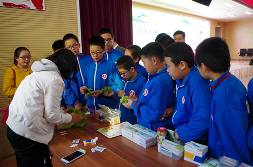 朝陽區發改委李主任針對低碳環保問題做完演講后同學們開始自由參觀,北京智云達家展示的快檢產品吸引了一批又一批前來體驗的中學生。