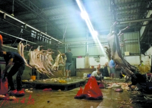 天氣漸冷,火鍋又熱,羊肉再走俏。然而,從屠宰場里出來、打著檢驗檢疫合格標(biāo)志的羊肉,是不是就一定可以放心食用呢?昨天凌晨,記者暗訪發(fā)現(xiàn),在橋頭鎮(zhèn)盛景禽畜市場內(nèi)的屠宰場,動物檢驗檢疫形同虛設(shè)。
