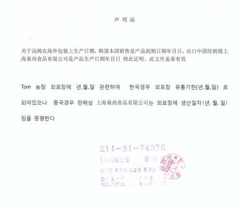 12月20日,1號店方面向澎湃新聞記者說明,韓國廠家確認了國內經銷商的說法,出口巢尚食品的湯姆農場產品外包裝所標日期為生產日期,并出具了說明函。