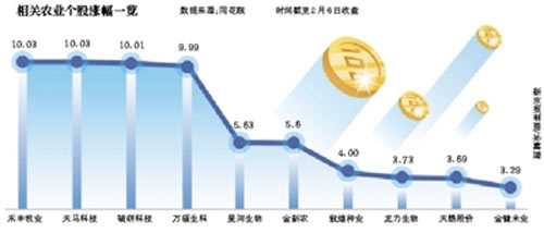 受此影響,2月6日,相關農業股、期貨等均出現大漲,其中,農產品加工、農機等農業股迎來新年首個紅包,漲幅居前,多只股票漲停。