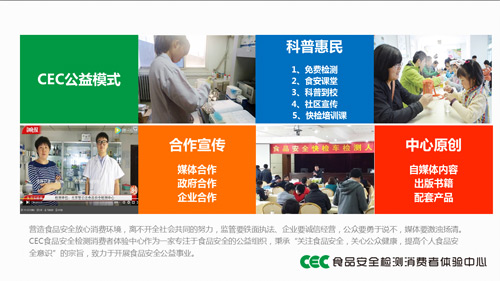 CEC體驗中心針對社會熱點以及常見食品安全問題,與中央電視臺、英國BBC、黑龍江電視臺、北京電視臺、河北衛視等多家電視臺合作拍攝近百場科普節目。與法制晚報、騰訊大燕網合作進行直播,從生活中常見的食品安全熱點問題出發,對網上流傳較廣的信息進行實驗驗證,將謠傳和誤傳擺上實驗臺,用真實的實驗數據粉碎食品安全謠言。此外還參加低碳大篷車科普活動以及遠赴非洲送去水質檢測設備的公益活動。