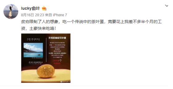 對于該茶葉的走紅,網友議論紛紛。有人認為這是嘩眾取寵,和某針管書法家有異曲同工之妙,有人詢問”吃了會上天?“,還有人一口認定”這不是洗錢嗎“,也有網友就所謂”精選果碳、潮州紅泥炭爐“提出質疑:”再牛逼的木材燒出來的火溫難道還有差別?“,更多網友自嘲,貧窮限制了人的想象,吃一個傳說中茶葉蛋,竟要花上我差不多半個月的工資。