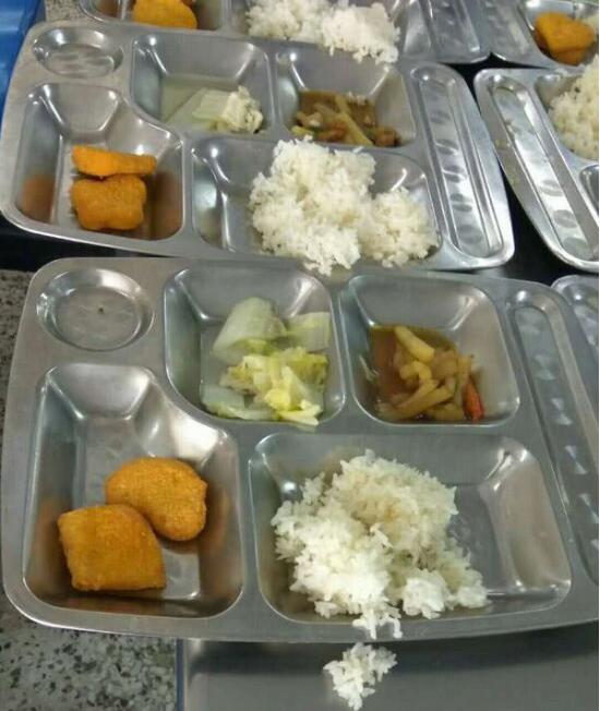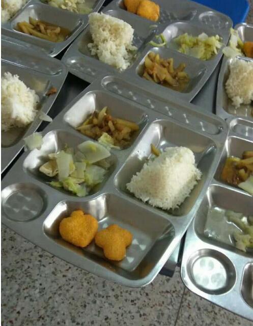 從 10 月 8 日下午開(kāi)始,照片陸續(xù)出現(xiàn)在微信群和其他自媒體上,并傳播開(kāi)來(lái)。記者從照片上可見(jiàn),在不銹鋼的餐盤(pán)上,除了少量米飯,還有三個(gè)菜,其中能看到土豆、白菜和兩個(gè)黃色的油炸小餅,與普通成人的飯量相比,份量均顯得明顯不足。