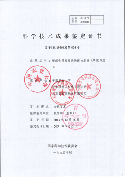 最終,智云達(dá)參與完成的“果蔬采后農(nóng)藥殘留及微生物快速檢測技術(shù)研究與應(yīng)用”、 “精煉食用油摻偽快速檢測技術(shù)研究與應(yīng)用項(xiàng)目”順利通過教育部科技成果鑒定,教育部已于12月25日向完成單位及各位完成者頒發(fā)了科學(xué)技術(shù)成果鑒定證書,這是對(duì)智云達(dá)研發(fā)能力的極大認(rèn)可,智云達(dá)將加倍努力研發(fā)更多、更好的產(chǎn)品以保障我國食品安全,使智云達(dá)真正成為行業(yè)研發(fā)的領(lǐng)導(dǎo)者和行業(yè)第一品牌。