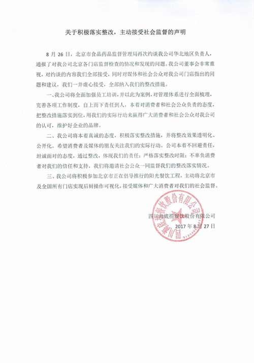在后廚臟亂問題被曝光后,8月25日下午,海底撈先后發(fā)布《關(guān)于海底撈火鍋北京勁松店、北京太陽宮店事件的致歉信》、《關(guān)于海底撈火鍋北京勁松店、北京太陽宮店事件處理通報(bào)》,承認(rèn)媒體披露的問題屬實(shí),道歉并公布了整改措施。