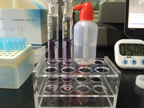 3、取一支10mL比色管,加入1mL樣品液,取一空白管內加入蒸餾水替代樣品液,分別加入C溶液80μL,加蒸餾水至10mL刻度線,加入D溶液0.5mL,搖勻,開蓋靜置10min。