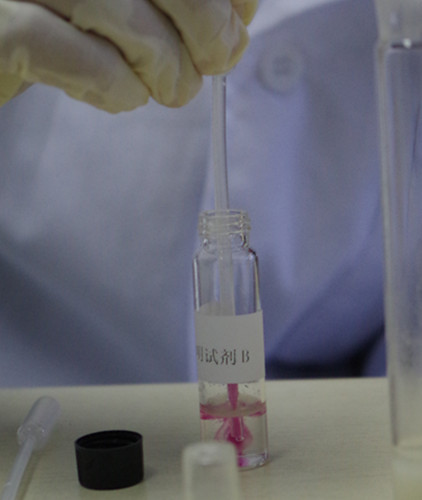 另取一支0.5 mL吸管,吸取試劑C至吸管細(xì)部前端約1/4處(約0.125 mL),插入至試劑B瓶的下層溶液中并緩慢排空,觀察B瓶下層溶液中是否產(chǎn)生渾濁絮狀物或沉淀物。