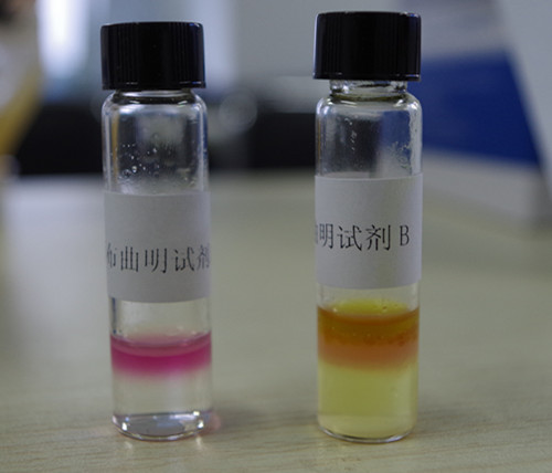 蓋緊蓋子,充分震蕩混勻1 min,靜置2~3 min,使上層液澄清。用0.5mL吸管吸取試劑A瓶中上層溶液約一半的量至試劑B瓶中;